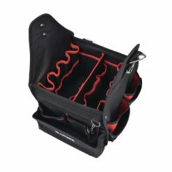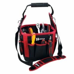 Ceinture porte outils polyestère. Doublage de la ceinture au niveau du dos. 16 poches de rangement. 1 porte marteau.
