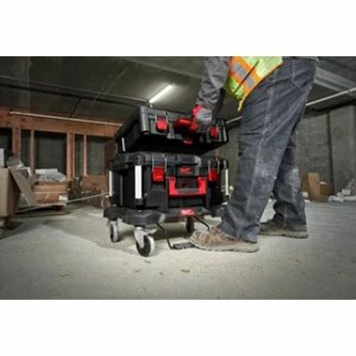 Le trolley plat PACKOUT de la marque Milwaukee dispose d’un frein et deux blocages sur les roues pour bloquer le trolley et connecter des coffrets et sacs PACKOUT™. Ce trolley fait partie du système de stockage modulaire PACKOUT™.